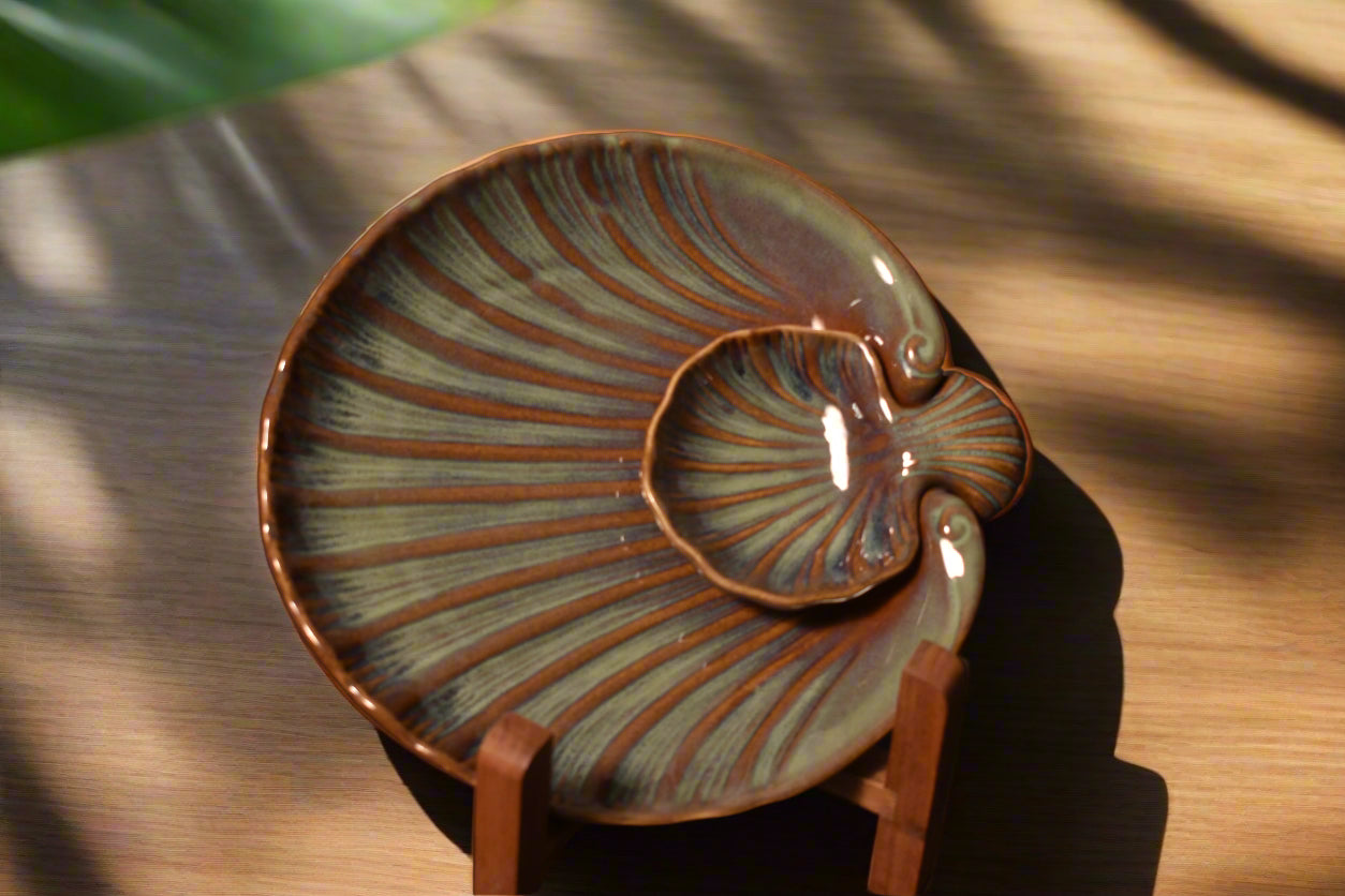Elevate your dining experience with this exquisite handcrafted ceramic plate, inspired by the beauty of ocean shells. Designed with an organic, flowing pattern in earthy brown and green hues, this plate is perfect for serving appetizers, snacks, or as a statement piece in your tableware collection. The glossy glaze finish enhances its artisanal charm, making it a must-have for lovers of unique and nature-inspired crockery.