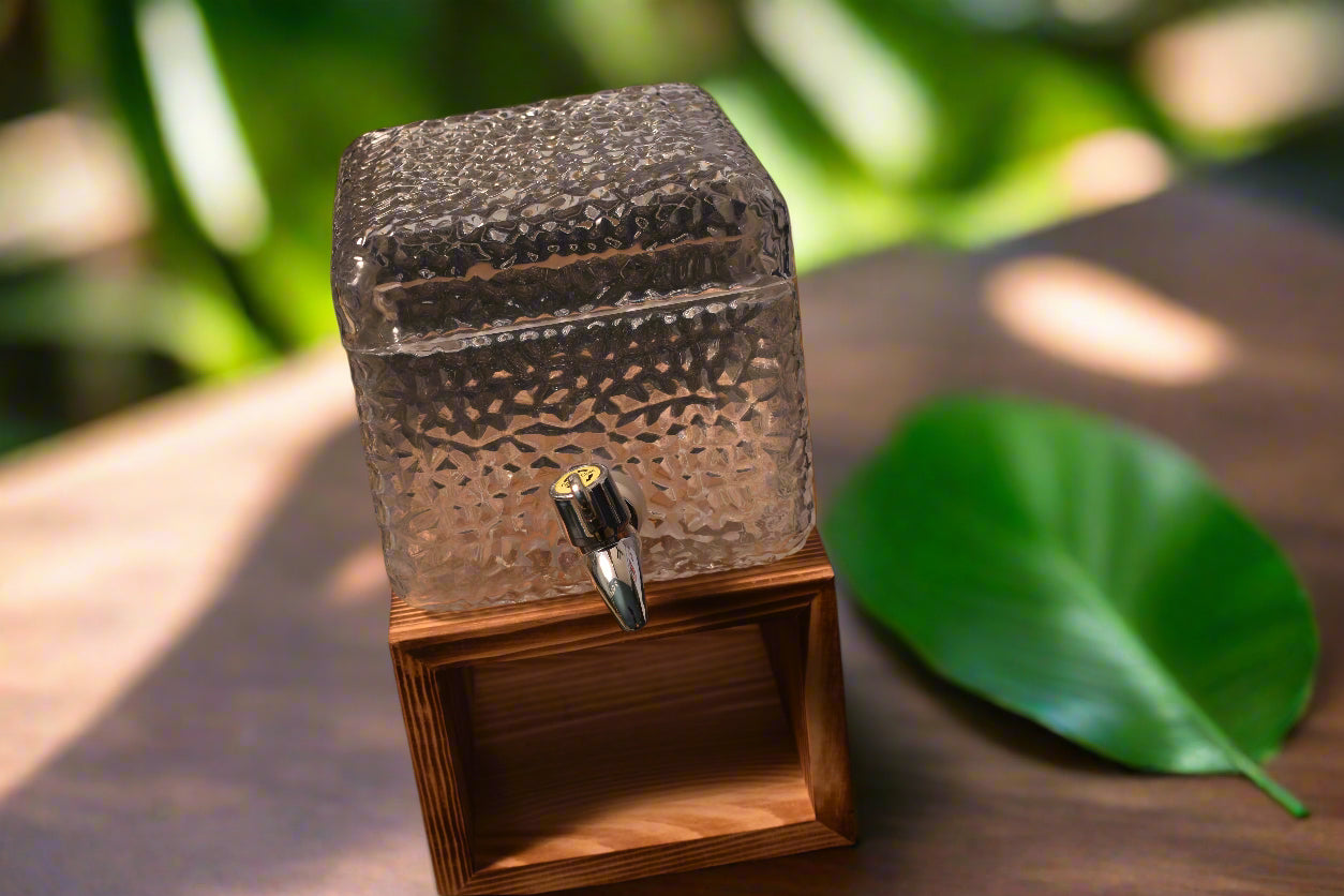 Elevate your table setting with this Textured Glass Water Dispenser, featuring a striking hammered glass finish and a sleek chrome-finished tap. Set atop a minimalist wooden stand, it’s both functional and decorative — ideal for serving water, infused drinks, or chilled beverages at home, cafés, or special gatherings.