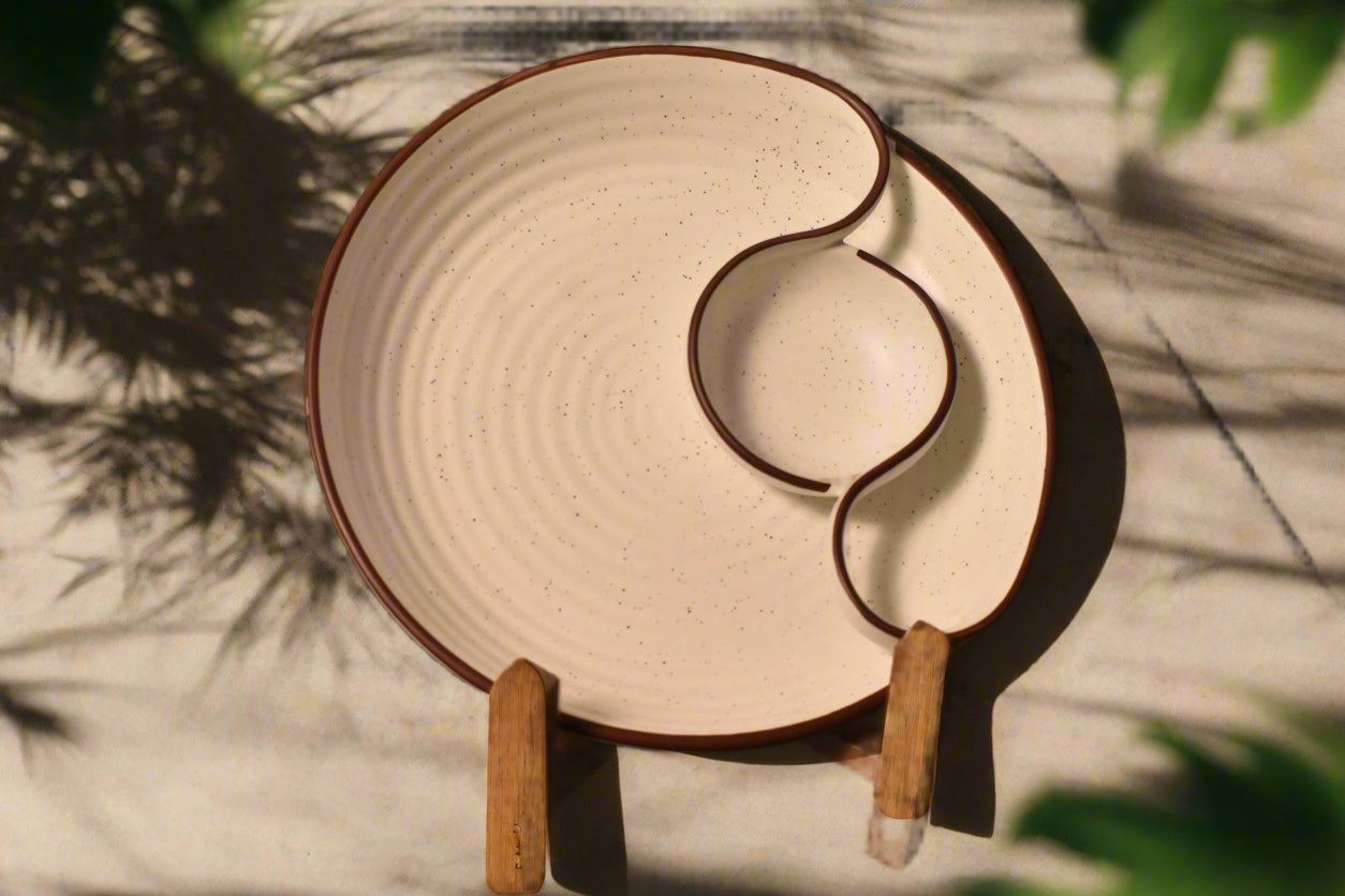 Enhance your dining experience with this Yin-Yang Ceramic Plate, designed for both style and functionality. The unique interlocking design allows for versatile serving, perfect for snacks, dips, or an elegant plating experience. Crafted with a matte speckled glaze and an earthy brown rim, this set adds a touch of balance and sophistication to any table setting.